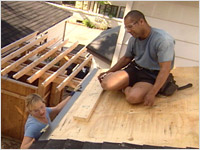 - It’s time to install the plywood sheathing. Use 3/8-inch plywood cut to the right dimensions. Nail it into place on the rafters. (see fig. I)